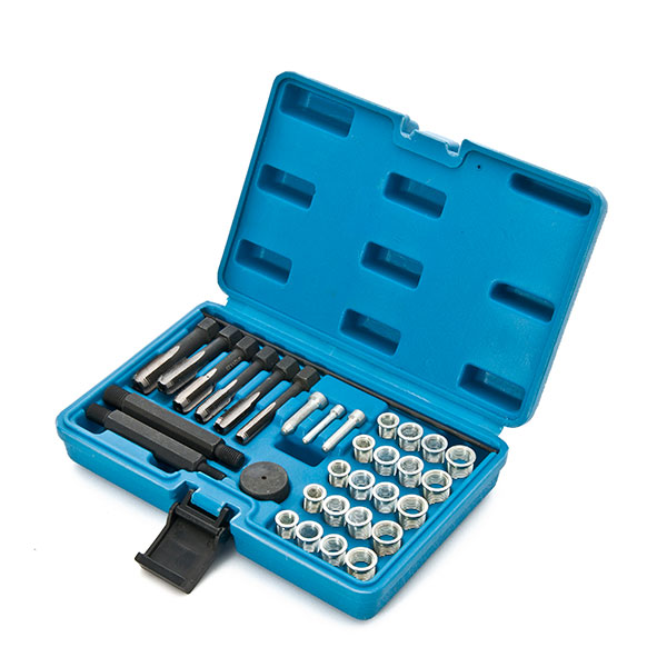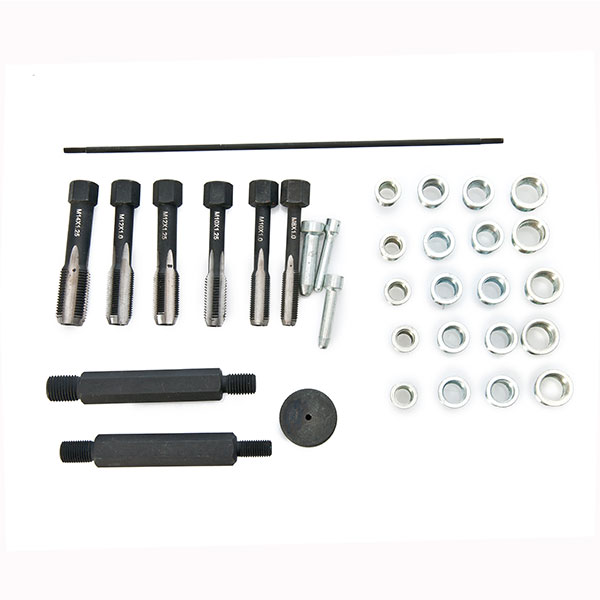 The glow plug metric thread repair kit comprises taps and coils to fix threads and glow plugs on alloy cylinder heads.