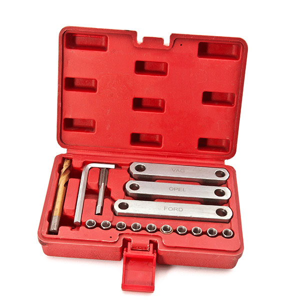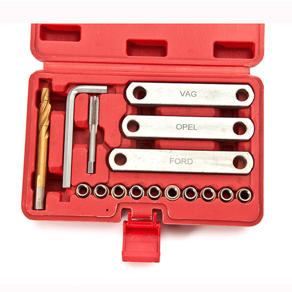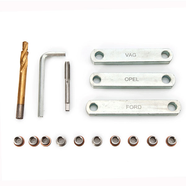Special tool for repairing brake caliper guide threads permanently, providing space guidance to ensure caliper guides are spaced correctly.