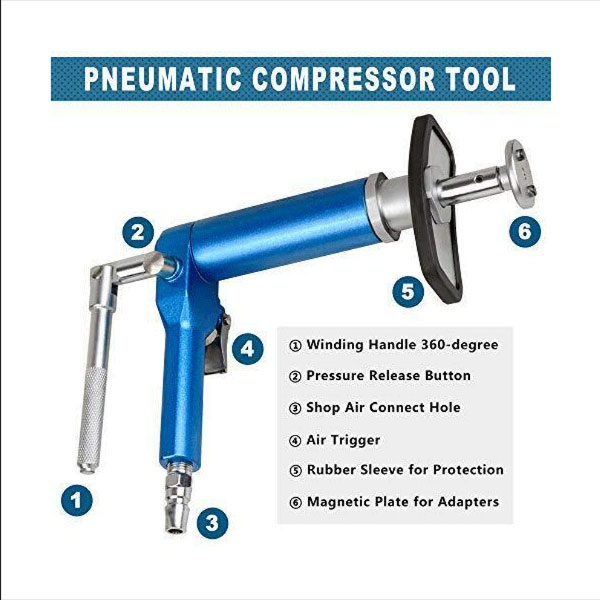 This compressor tool comes with a knurled handle that can move in both clockwise and counterclockwise directions for both left and right pistons.